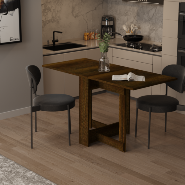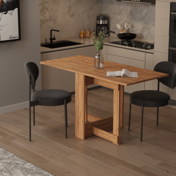 Modern ahşap dokusu ve katlanabilir yapısıyla öne çıkan bu açılır masa; kapalıyken dar alanlarda yer kaplamaz, açıldığında ise konforlu bir yemek ya da çalışma masasına dönüşür. Mutfak, salon ve stüdyo daireler için hem estetik hem fonksiyonel bir çözümdür.