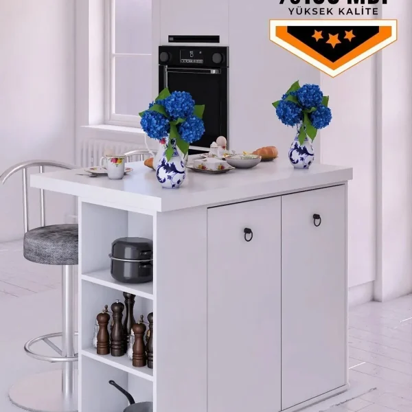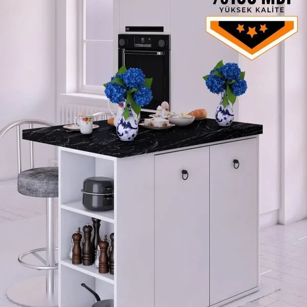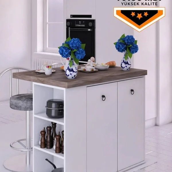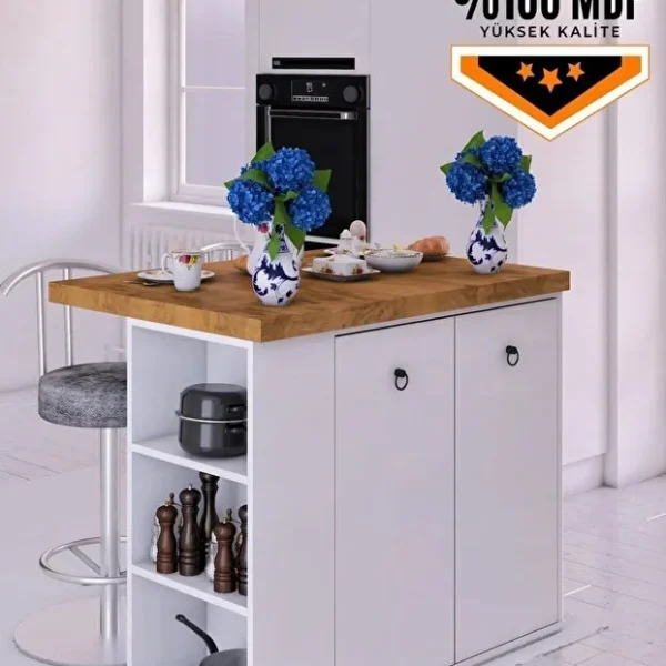 Alt kısmında yer alan iki kapaklı dolap; tencere, kuru gıda ve büyük mutfak malzemeleri gibi eşyalarınızı saklamanıza yardımcı olurken, yan tarafında bulunan 3 adet açık raf ile sık kullanılan ürünlere kolay erişim sağlanır. Bu çok yönlü tasarımıyla Noma mutfak adası, işlevsellikten ödün vermeden düzenli bir mutfak ortamı oluşturur.