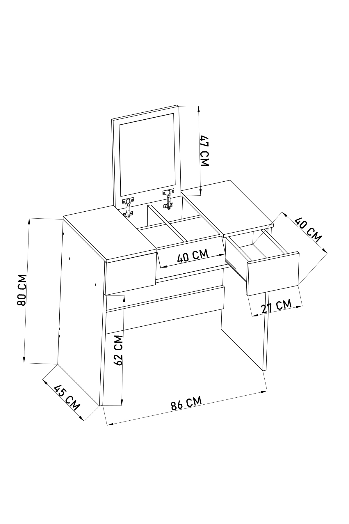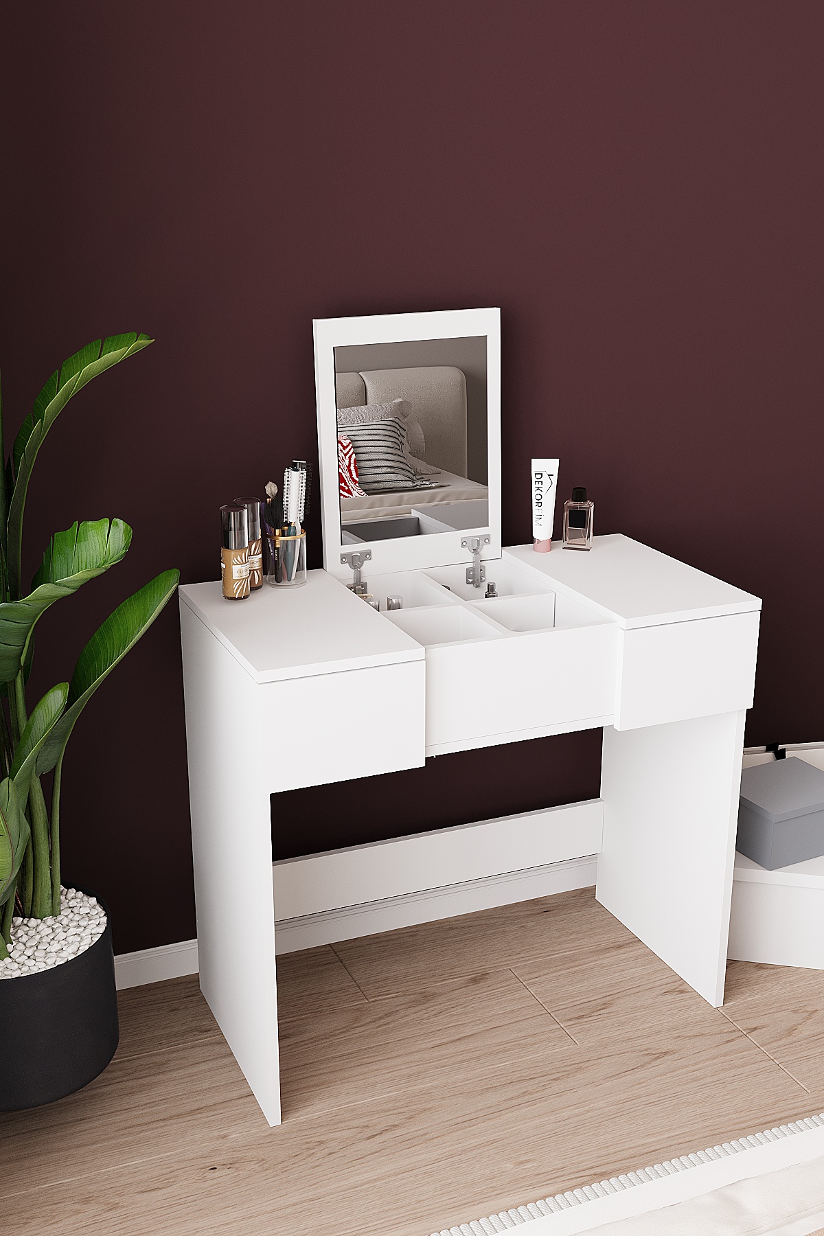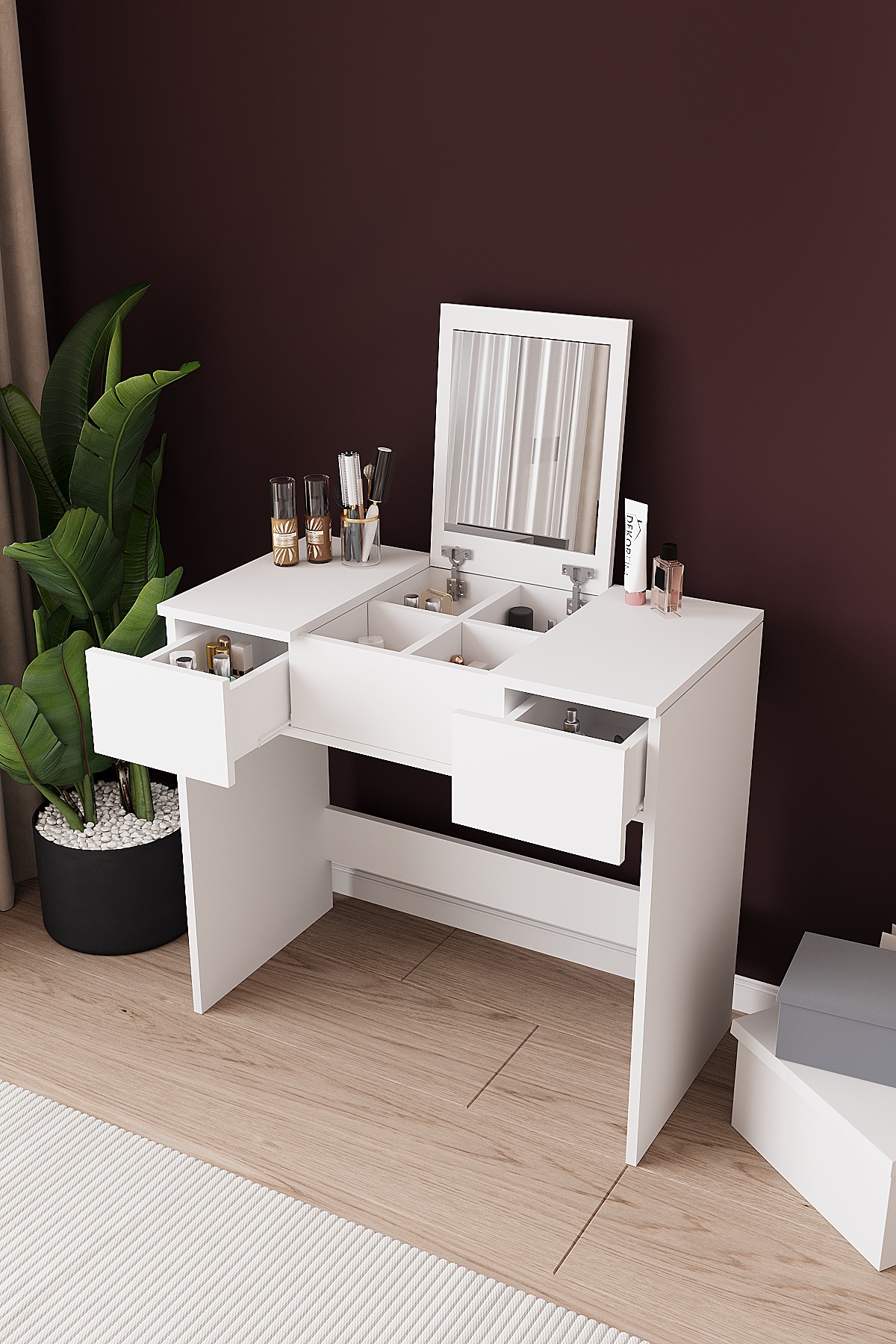 Modern tasarımı ve fonksiyonel yapısıyla öne çıkan aynali çekmeceli makyaj masası, günlük makyaj ve kişisel bakım rutininizi daha düzenli ve keyifli hale getirmek için tasarlanmıştır. Geniş kapaklı makyaj masası yapısı sayesinde hem estetik bir görünüm sunar hem de ihtiyaç duyduğunuz tüm ürünleri kolayca organize etmenizi sağlar.