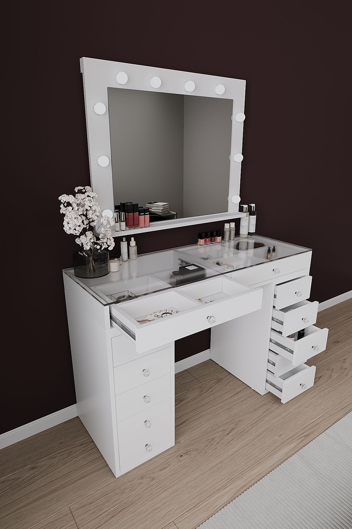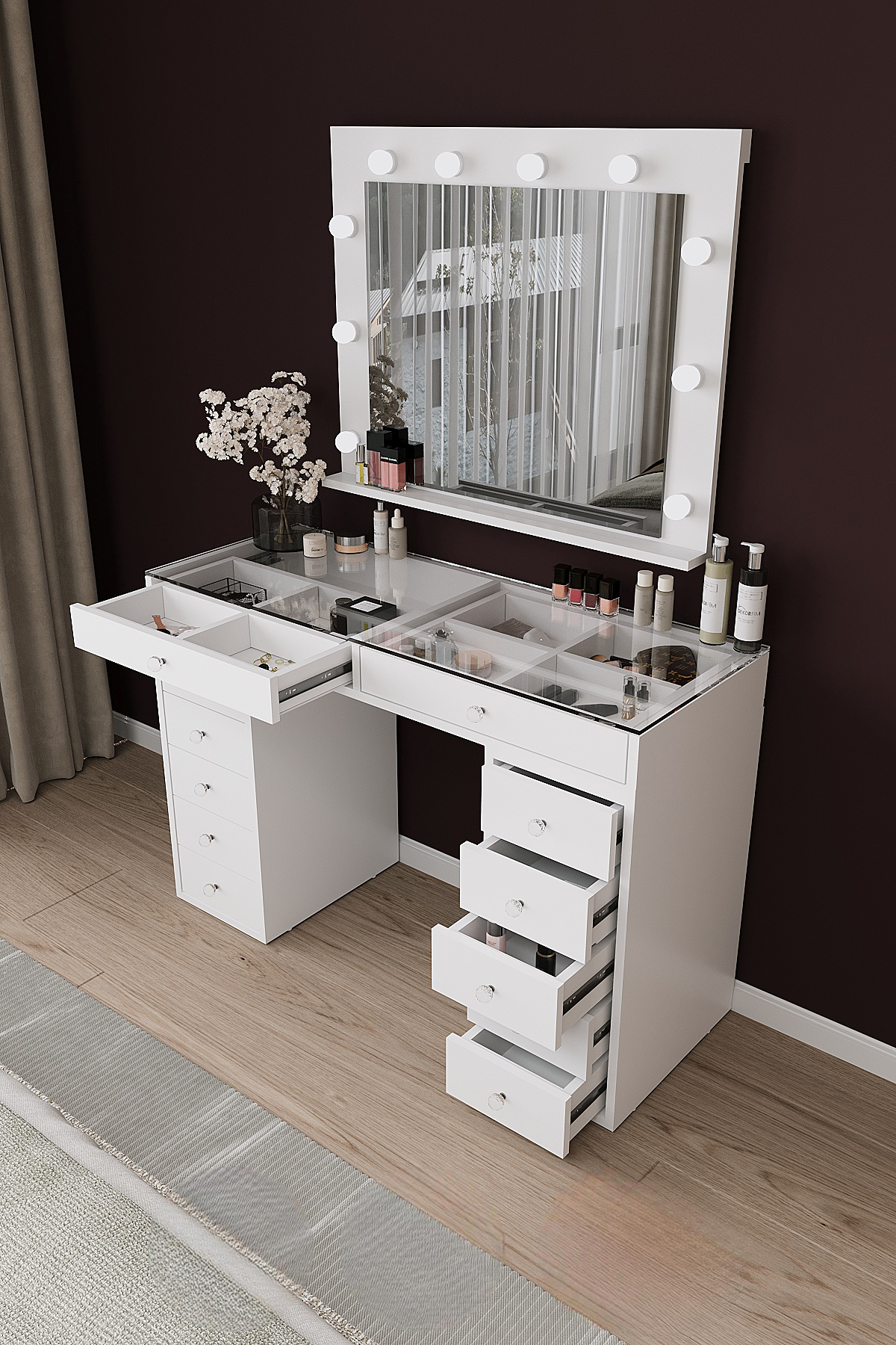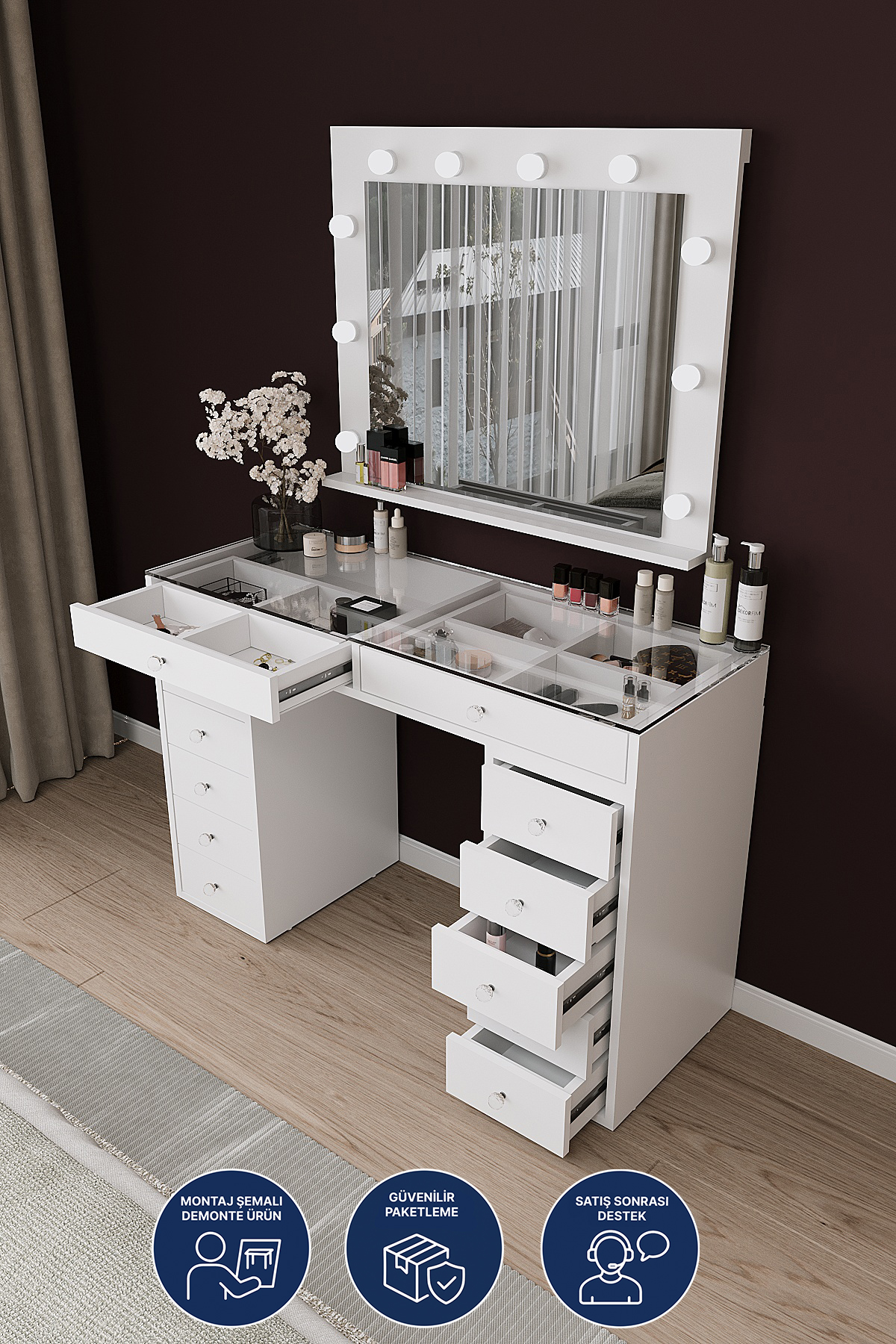 Modern tasarımı, ışıklı aynası ve 12 çekmeceli geniş depolama alanı ile öne çıkan bu makyaj masası; hem estetik hem de fonksiyonel bir kullanım sunar. Cam üst yüzeyi sayesinde çizilmeye karşı dayanıklıdır ve uzun ömürlü kullanım sağlar.
