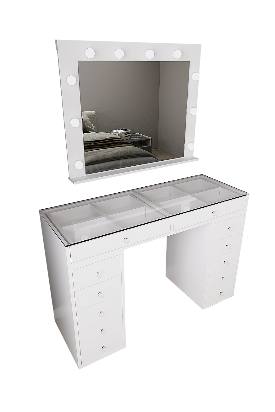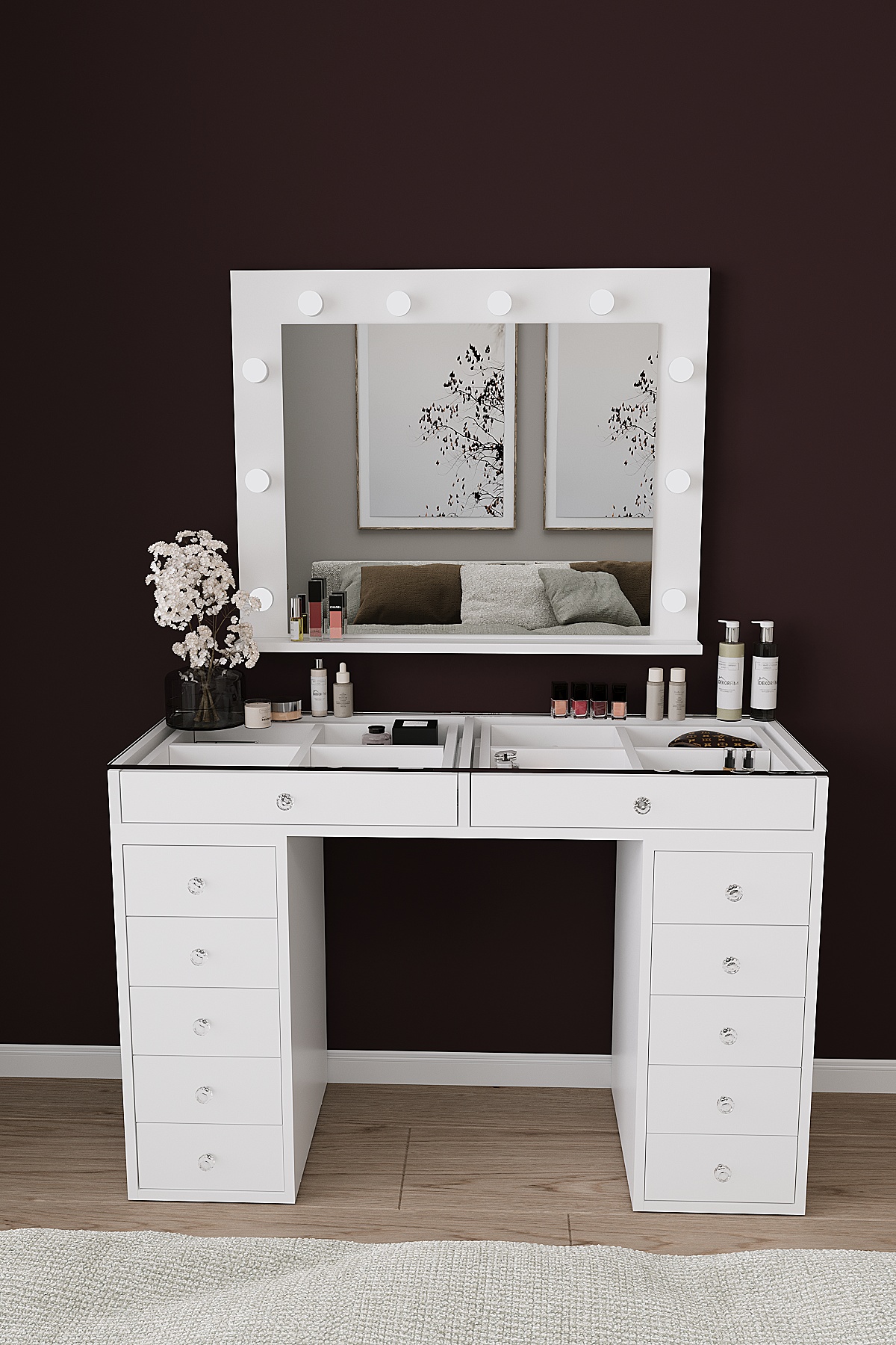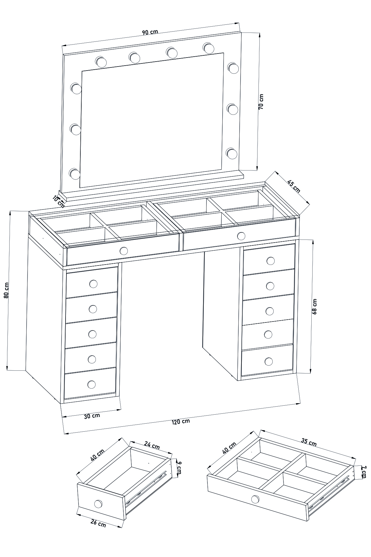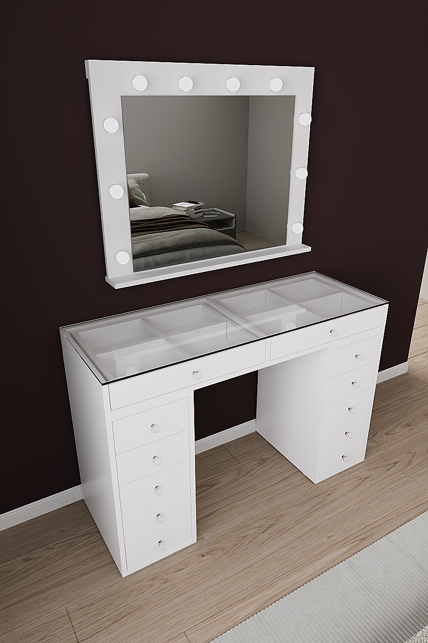 Modern tasarımı, ışıklı aynası ve 12 çekmeceli geniş depolama alanı ile öne çıkan bu makyaj masası; hem estetik hem de fonksiyonel bir kullanım sunar. Cam üst yüzeyi sayesinde çizilmeye karşı dayanıklıdır ve uzun ömürlü kullanım sağlar.