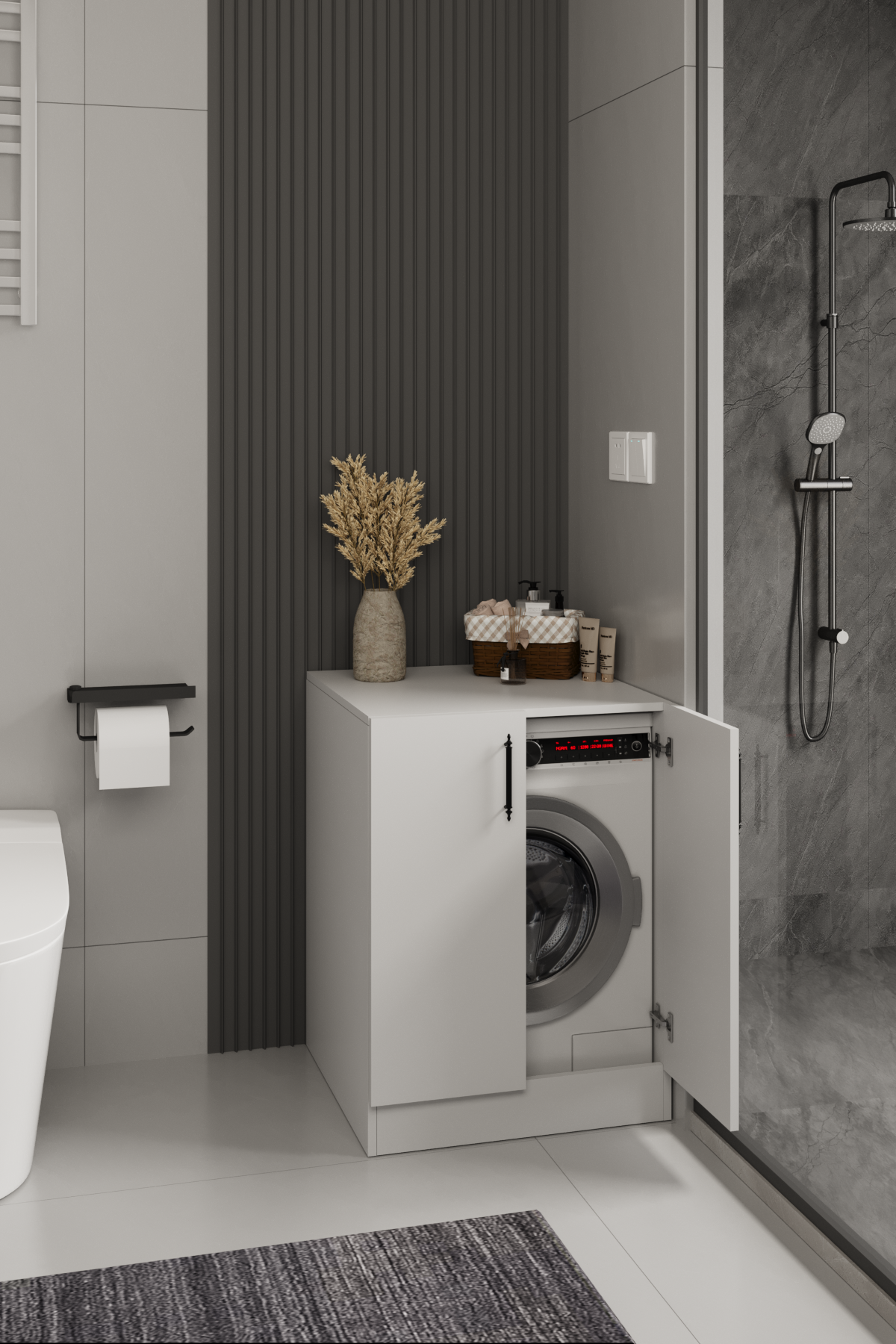 Banyo ve çamaşır alanlarında düzenli, sade ve modern bir görünüm arayanlar için tasarlanan bu çamaşır makinesi dolabı, çamaşır makinesinin üstünü estetik ve kullanışlı bir depolama alanına dönüştürür 🤍