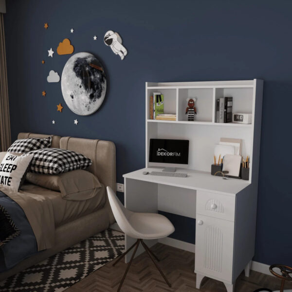 Çocukların düzenli bir şekilde ders çalışmasını teşvik eden tasarımıyla çocuk çalışma masası, bilgisayar ve aksesuar yerleşimine uygun yapısıyla genç odası bilgisayar masası olarak kullanılabilir.