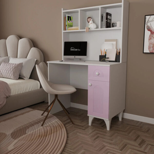 Estetik görünümüyle olduğu kadar işlevselliğiyle de öne çıkar. Geniş çalışma alanı, kullanışlı çekmece ve dolap bölmesi ile kitaplıklı üst yapısı, çocuk ve genç odalarında düzenli, motive edici bir çalışma alanı oluşturur. Canlı pembe kapak detayı ise odanıza enerjik bir dokunuş katar.