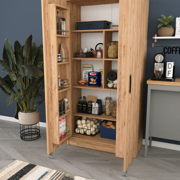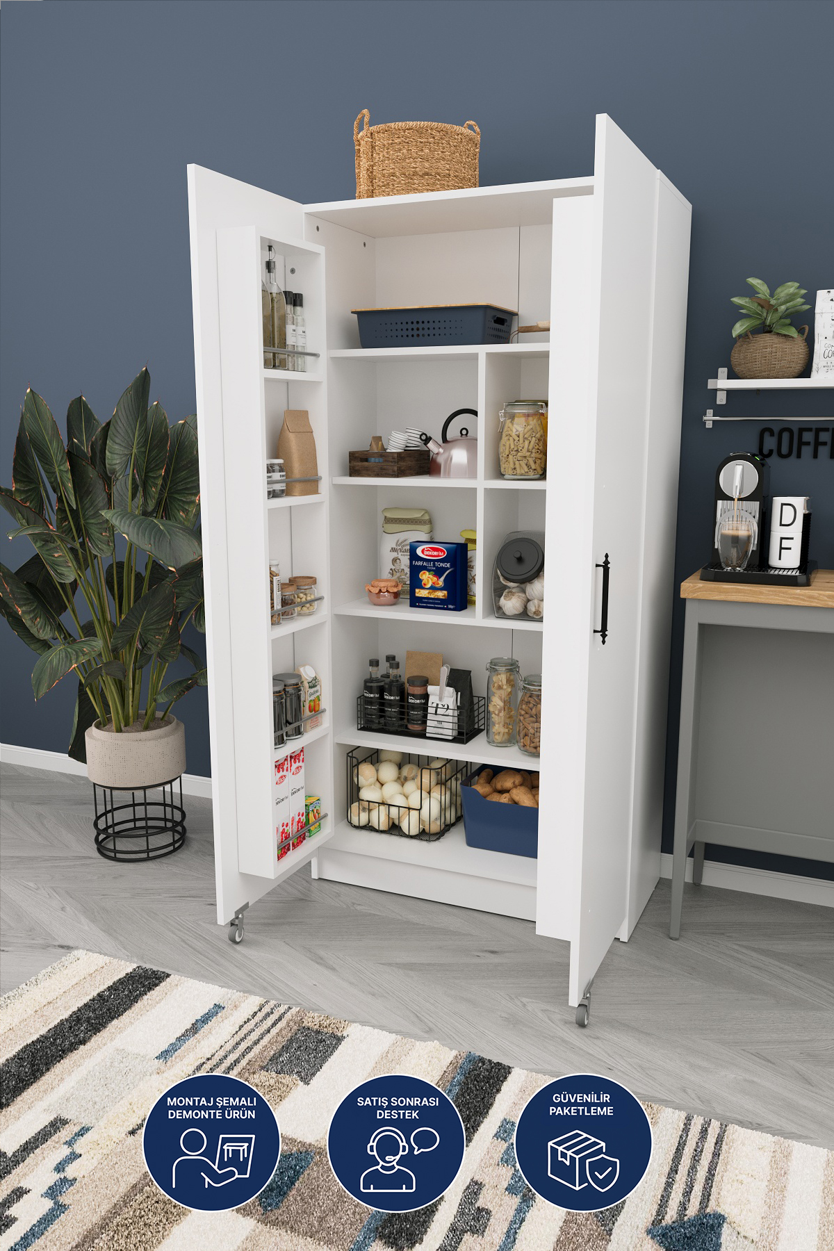 Bu kiler dolabı, kuru gıda, bakliyat, kavanoz, baharat, mutfak gereçleri ve küçük ev aletlerini düzenli bir şekilde saklamak için özel olarak tasarlanmıştır. Kapak içi raf sistemleri, standart dolaplara kıyasla %30’a varan ekstra depolama alanı sunar.
